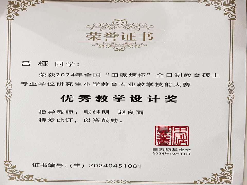 我院学生在2024年全国“田家炳杯”全日制教育硕士专业学位研究生“小学教育”、“特殊教育”领域教学技能大赛中再获佳绩