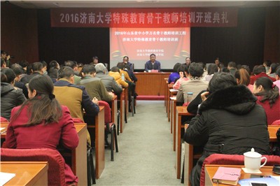 11月13日,济南大学特殊教育学院承办的“2016年山东省中小学万名骨干教师培训工程”——济南大学特殊教育学校骨干教师培训班开班仪式在汇源宾馆举行。仪式由济南大学特殊教育学院、教育与心理科学学院副院长王本法主持,特殊教育学院、教育与心理科学学院党委书记王希普,济南大学校友工作办公室主任杨延鲁,教育与心理科学学院办公室主任张宝华,教师教育教学部主任郑宇红出席此次开班仪式,同时来自省内各市区县特殊教育学校的骨干教师、普通学校的随班就读教师和资源教师等90余人参加此次开班仪式。
