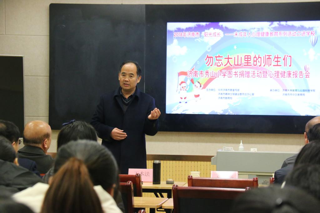 11月22日下午,由中共济南市委宣传部、济南市精神文明建设委员会办公室与济南市教育局联合主办,由济南大学教育与心理科学学院和市中区教育局联合承办的2018年济南市“阳光成长”——未成年人心理健康教育系列活动进学校之“毋忘大山里的师生们——秀山小学图书捐赠活动暨心理健康报告会”在市中区秀山小学报告厅举行。济南大学教育与心理科学学院副院长王本法、办公室主任张宝华、教师冯晶博士、校园国学杂志主编魏新鹏、济南市市中区区政府教育督导室主任郗组平和秀山小学全体教师参加了此次活动。