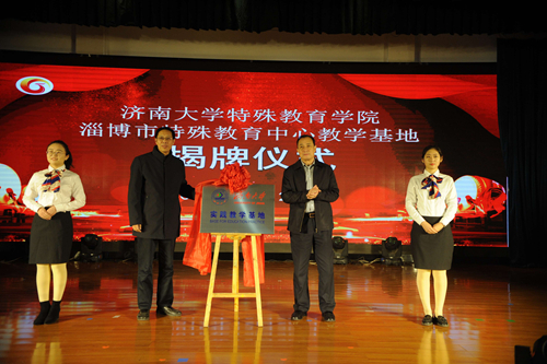 济南大学教育与心理科学学院杨昭宁院长和淄博市教育局党组副书记、副局长何向东共同为“济南大学实践教学基地”揭牌。