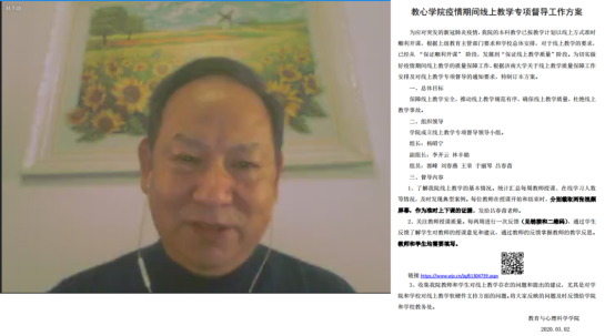 为应对突发的新冠肺炎疫情,我院的本科教学已按教学计划以线上方式准时顺利开课。根据上级教育主管部门要求和学校关于《济南大学关于加强2020年春季学期本科线上教学保障的通知》要求,为保证我院后续线上教学质量,切实做好疫情期间线上教学质量的保障工作,学院成立了以杨昭宁院长为组长的线上教学督导领导小组。学院教学督导委员会主任林丰勋教授起草制定了《教心学院疫情期间线上教学专项督导工作方案》,并在此次研讨会上与全院老师进行了交流沟通。该方案在不增加授课教师额外教学负担的同时,保证学院能够及时了解本院线上教学基本情况、教师的授课质量以及教学效果,以确保疫情期间我院所有在线课程的顺利实施。