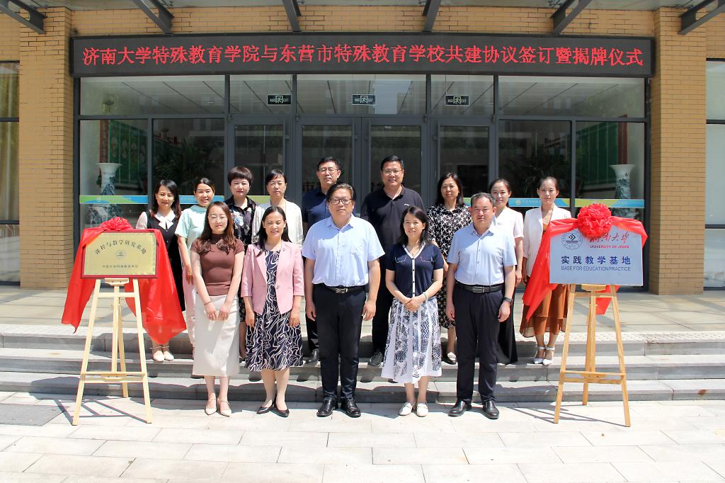仪式上,济南大学特殊教育系主任宿淑华与黄振东签订合作共建基地协议。季竹君与李玉珍共同为“济南大学本科实践教学基地”“济南大学特殊教育学院课程与教学研究基地”揭牌。