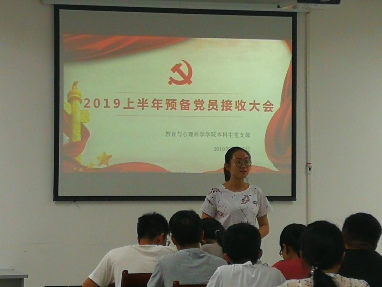 中共济南大学教育与心理科学学院本科生支部委员会于6月15日19:00在特教大楼A302举行了2019上半年接收预备党员大会,学院组织联络员魏文静出席,支部全体党员参加,本次会议由党支部书记甄馨主持。