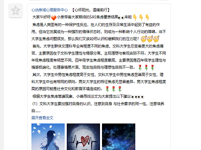利用学院专业优势,心动泉城心理服务中心志愿者制作出一系列心理测量量表,其中包括焦虑、抑郁、安全感与孤独感等一系列的自测量表,并于327日公开收集信息,免费供大学生进行自我测试。我院学生高度关注自身的心理健康情况,积极参与测试,同时期待着测量结果的推送。经过志愿者们一周的数据收集和精确分析,42日上午,心动泉城心理服务中心QQ推送号公布了SAS焦虑量表结果,揭示了当代大学生面临的焦虑问题,分享了焦虑方面的相关专业知识。同时也提出了缓解压力的方法与建议,以帮助当代大学生更好地了解和调节自身心理状态。
